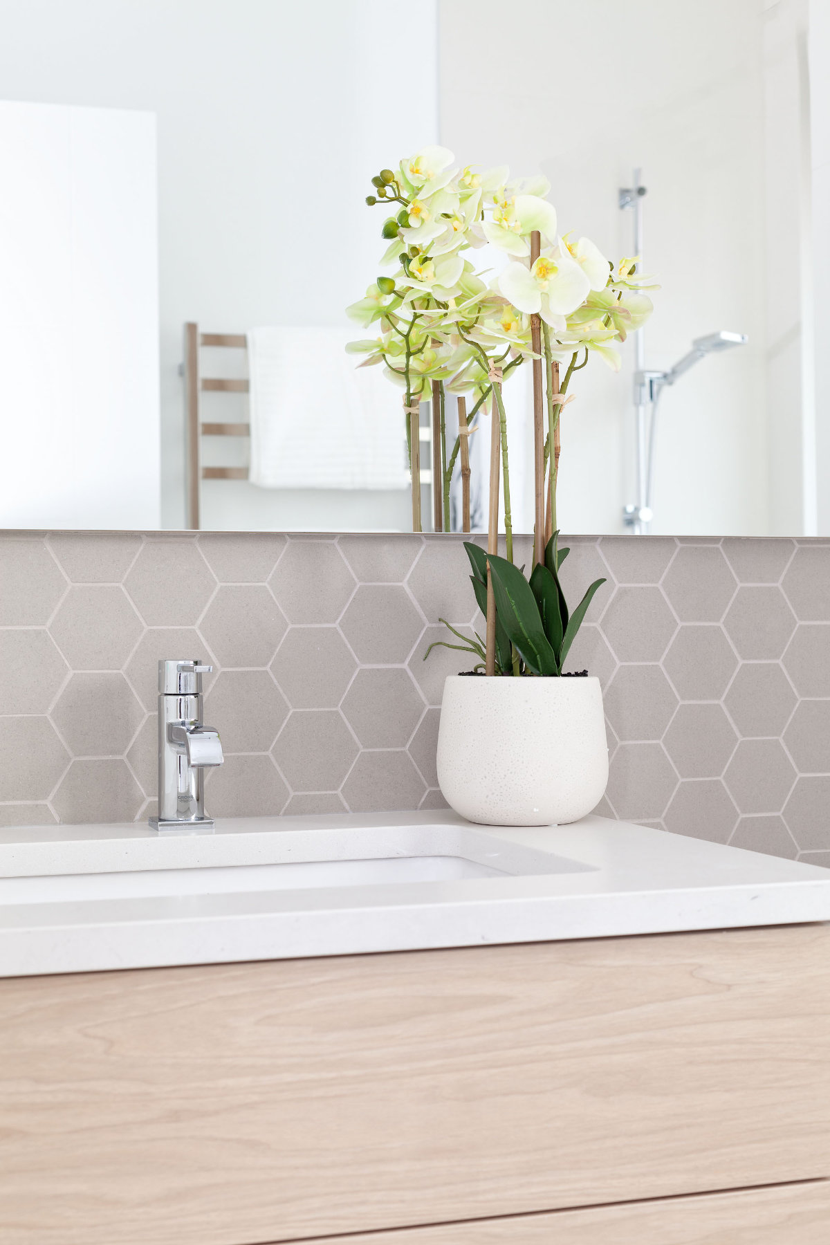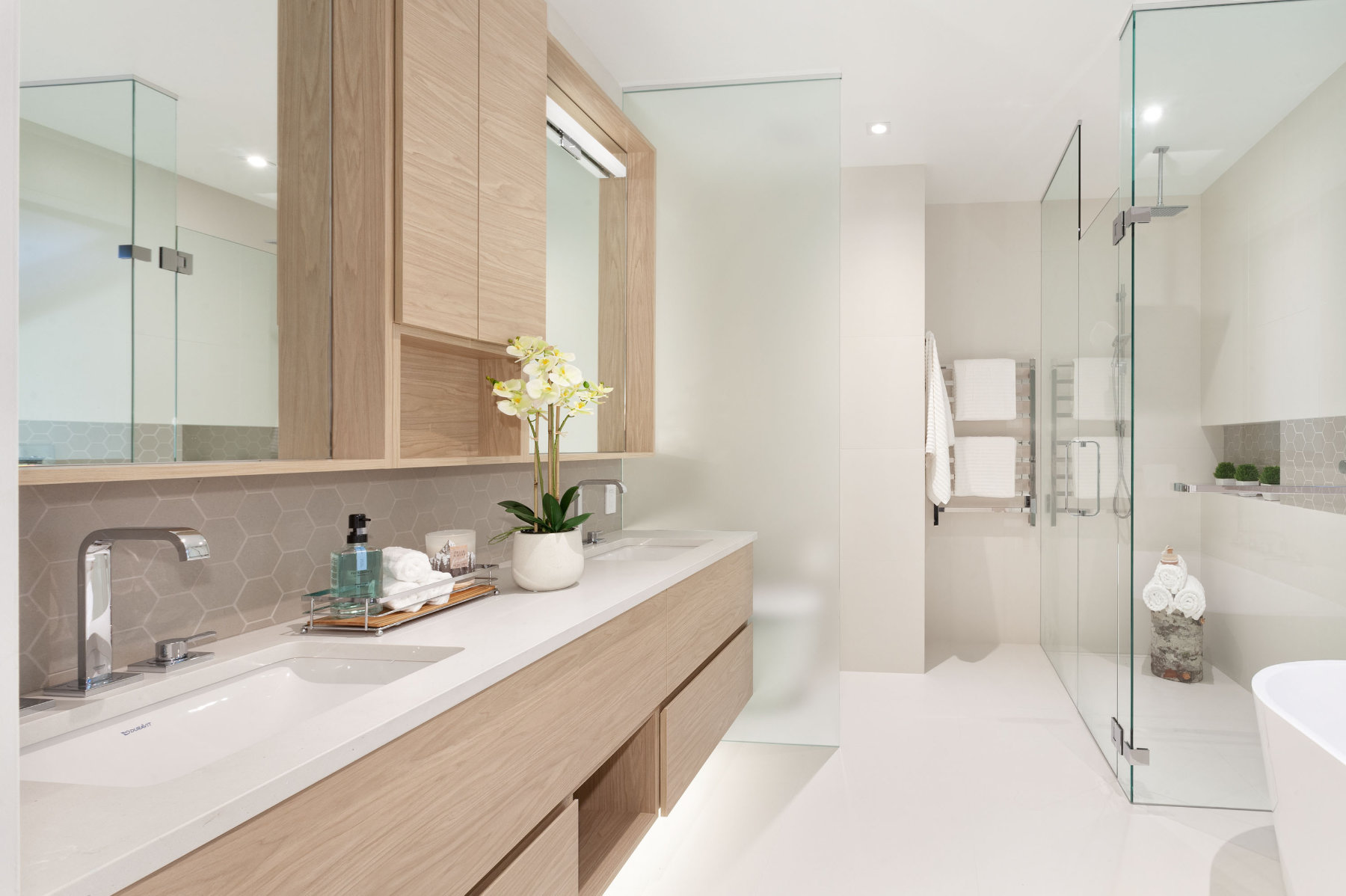 Spa-like bathroom with floating vanity and decorative greenery in luxury Whistler home