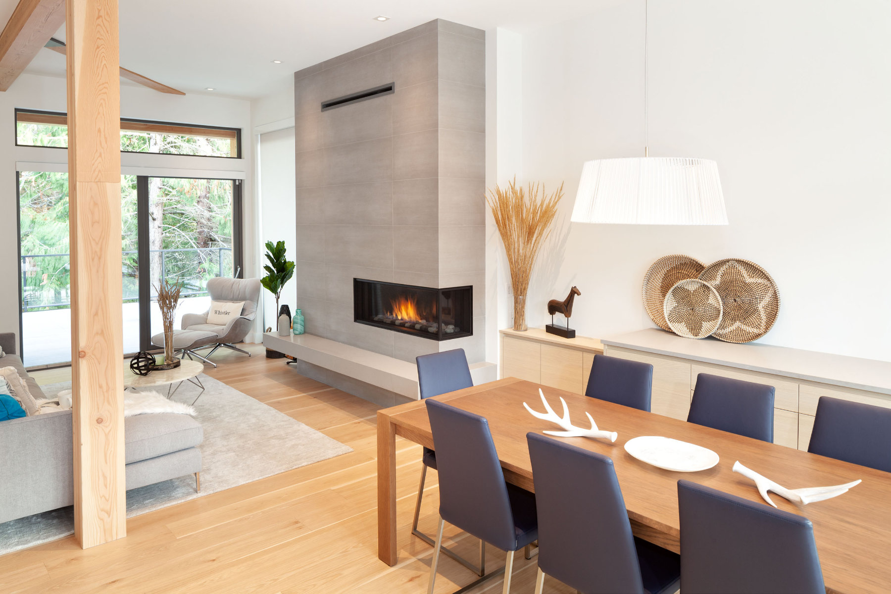 Open concept living and dining area with modern fireplace and mountain views in Whistler custom home
