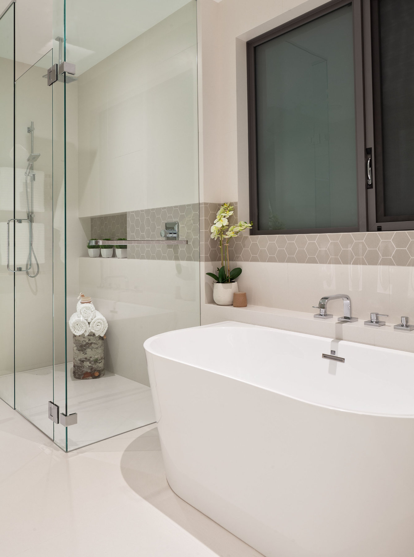 Luxury white bathroom with glass shower enclosure and marble tile in Whistler custom home