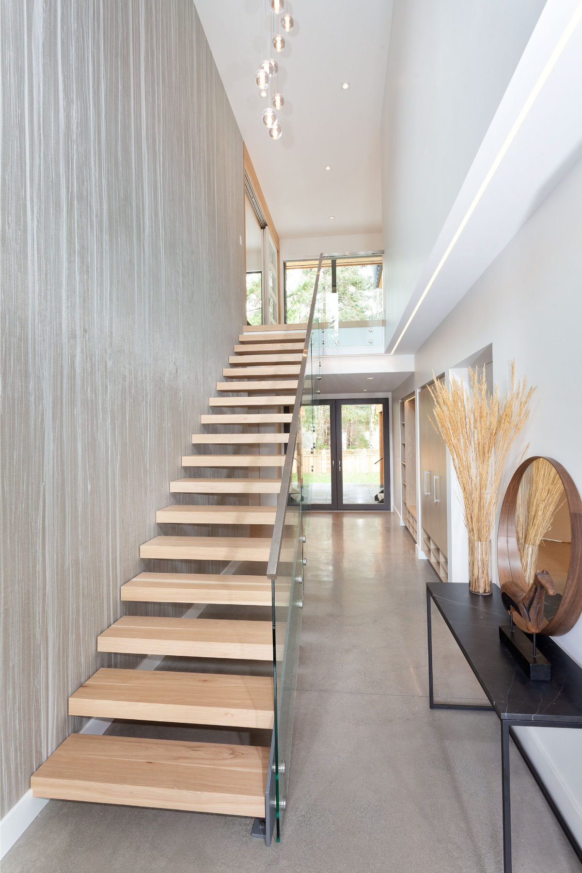 Contemporary staircase with glass railing and natural light in Whistler custom home
