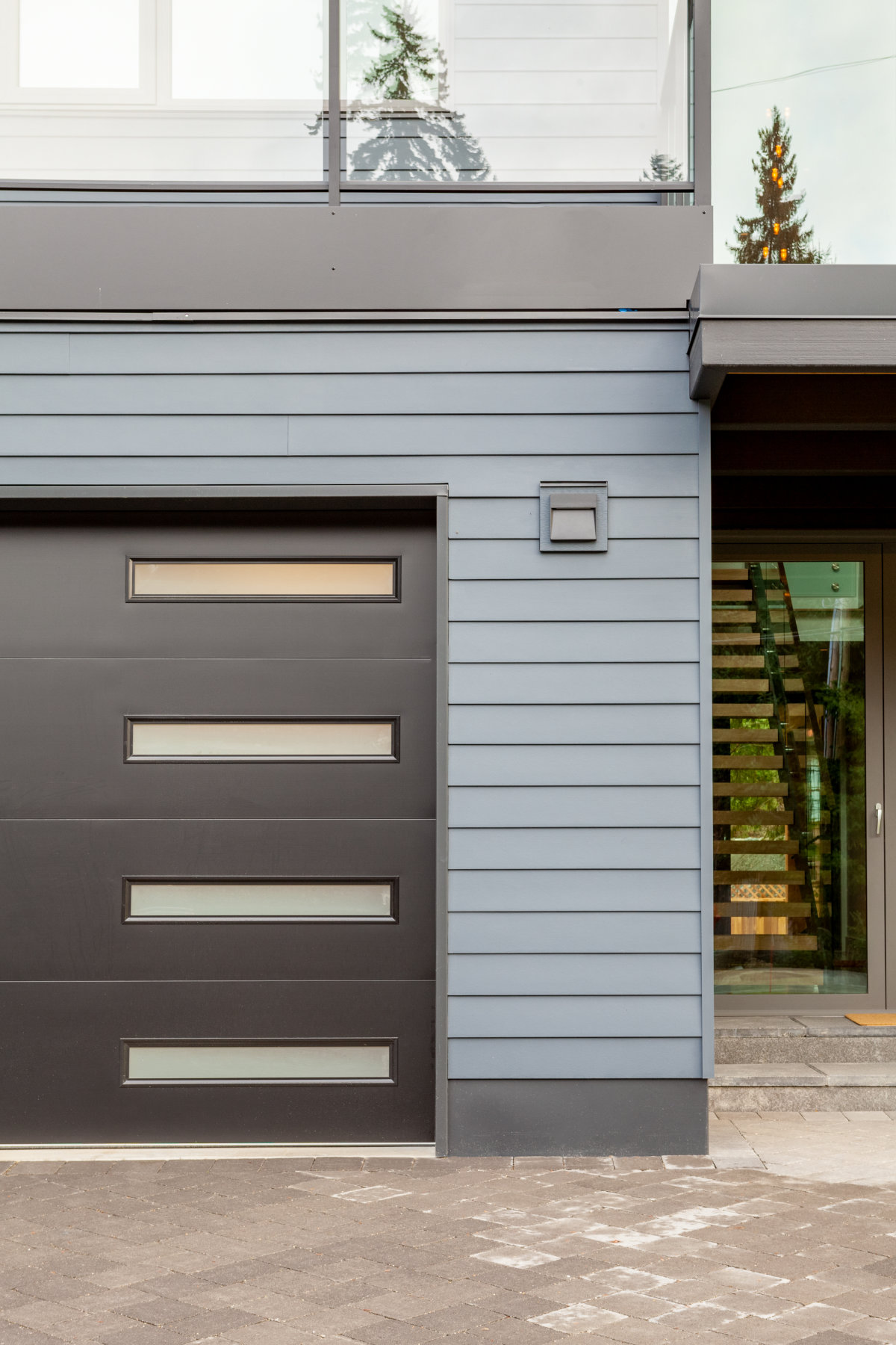 Contemporary front entrance with horizontal slat door and stone accents in Whistler custom home